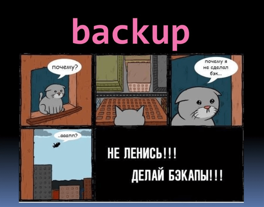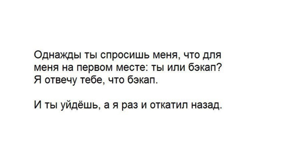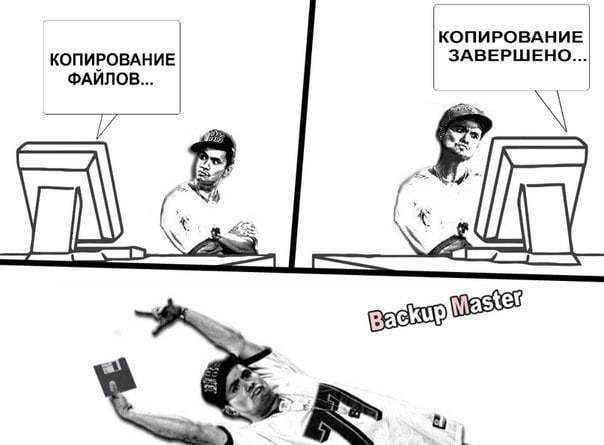 Кстати, специалисты шутят о том, что люди делятся на два типа: «те, кто делает бэкапы, и те, кто уже делает бэкапы». «Уже» в данном случае говорит о том, что потеря данных была, и запомнилась она надолго. В сети мы нашли множество смешных шуток на эту тему. Некоторые из них можете посмотреть в галерее.