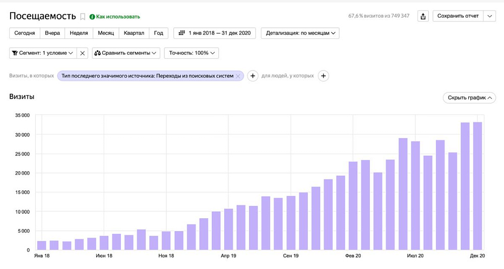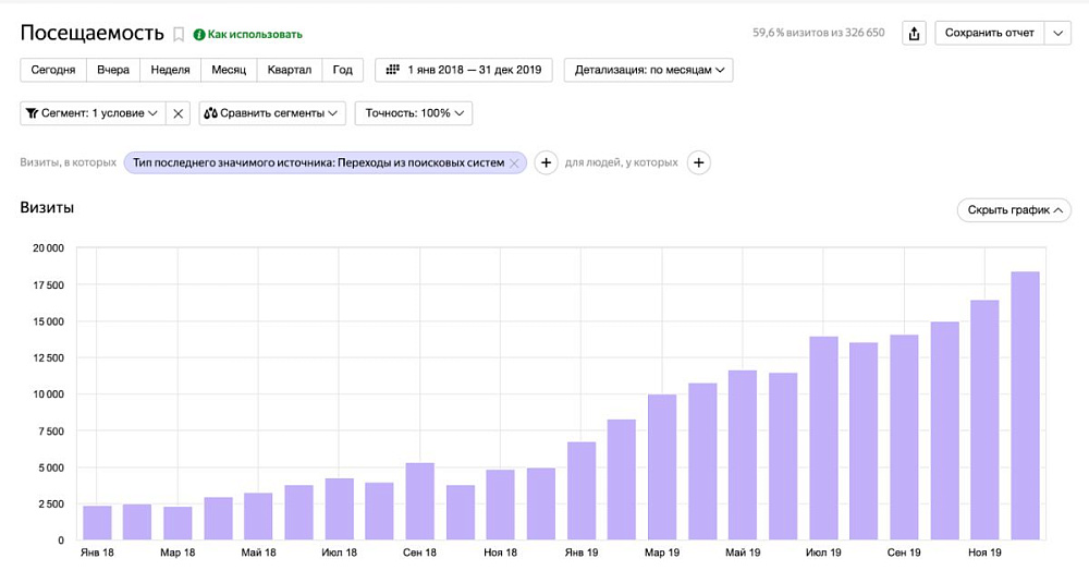 Если смотреть динамику количества посетителей с поисковых систем, то в феврале 2018 (до начала работ) на сайте было 2303 уникальных пользователей, а в феврале 2019 года их число увеличилось в 3 раза, до 6674 посетителя. К февралю 2020 года трафик еще раз утроился - до 18409 посетителей