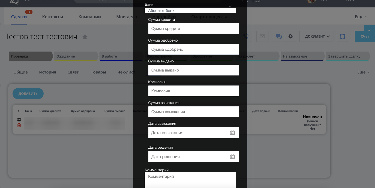 Были сделаны интеграции со сторонними сервисами проверки кредитной истории, ФСПП клиентов, на основе данных которых строились отчеты. Всё это делалось в 1 клик напрямую из карточки клиента. Например, менеджеру нужно запросить кредитную историю клиента. Для этого он нажимает на кнопку со стороннего сервиса, и все отчеты подтягиваются и прикрепляются в карточку сделки. Такая интеграция сделала работу в разы удобнее и комфортнее, поскольку все действия в одном окне.