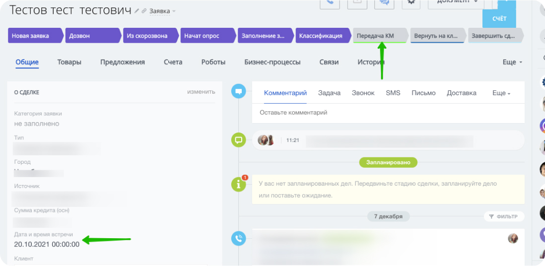 2) Оператор переводит сделку на определенный статус. Если поле не заполнено, то можно передвинуть заявку на статус передача КМ, в этом случае будет назначена встреча для удаленных сотрудников (вне офиса).